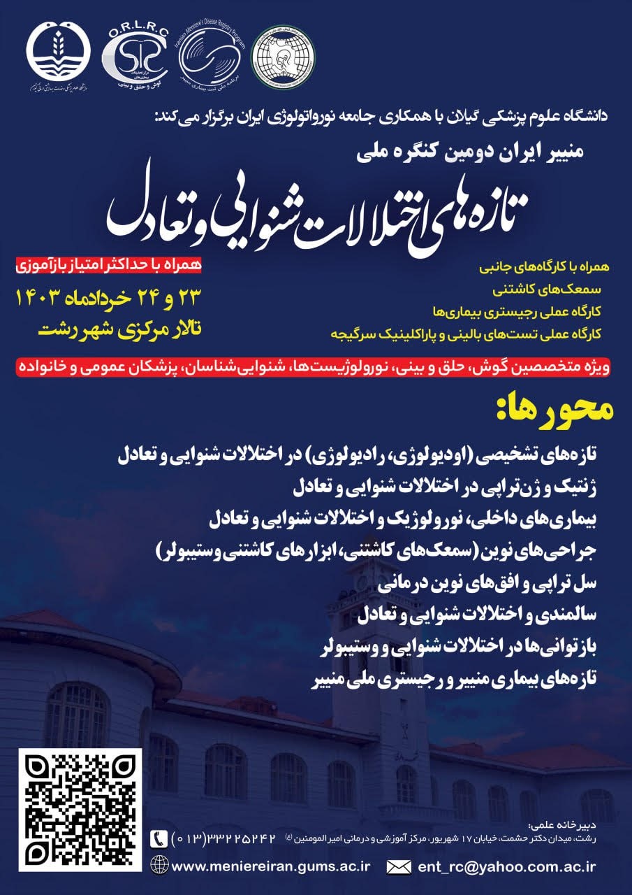 دانشگاه علوم پزشکی گیلان، دومین کنگره کشوری منییر ایران(تازه های اختلالات شنوایی و تعادل) را خردادماه سال 1403 در رشت برگزار می کند.