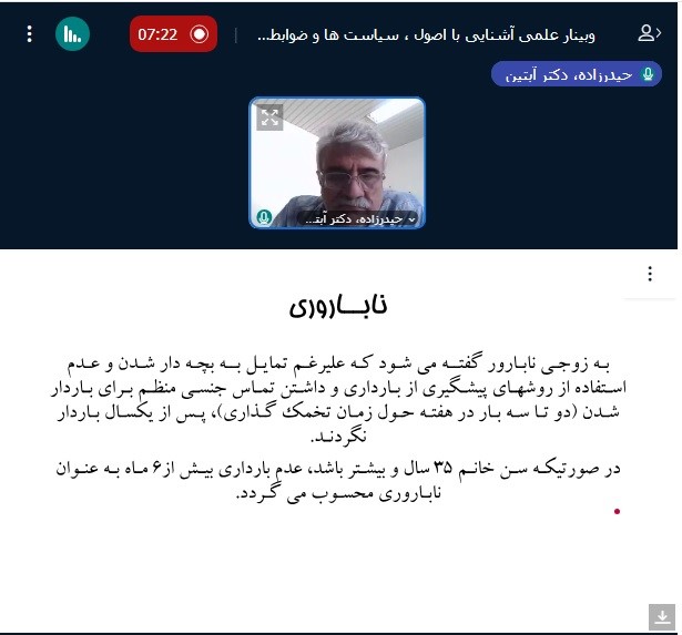 در این وبینار، مطالب جامعی در خصوص: کلیات ناباروری و درمانهای آن و ضوابط بیمه سلامت در حوزه خدمات تشخیصی درمانی زوجین نابارور ارائه شد.