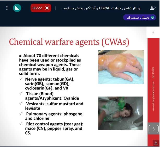 در این وبینار، مطالب جامعی در خصوص: آمادگی بخش بیمارستانی و پیش بیمارستانی نظام سلامت در حوادث شیمیایی، بیولوژیکی ، پرتویی، رادیویی و حوادث انفجاری ارائه شد.