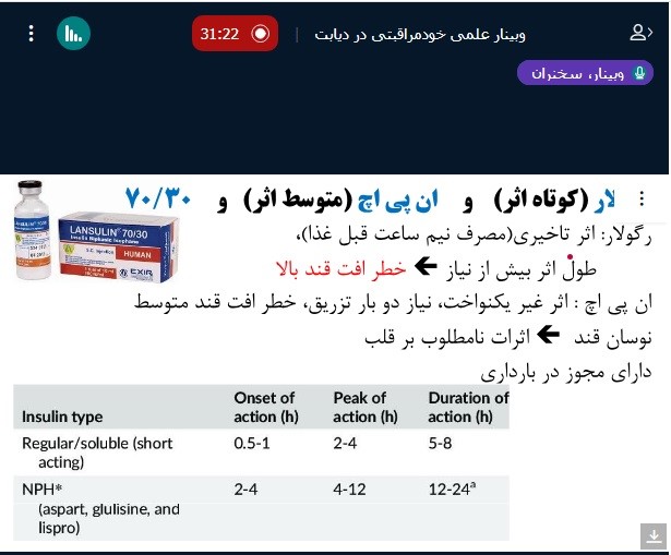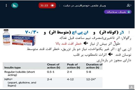در این وبینار، مطالب جامعی در خصوص: تعریف دیابت، انواع دیابت،درمان، داروهای خوراکی دیابت، داروهای تزریقی دیابت، خودمراقبتی در انواع دیابت،مراقبتهای پرستاری درافراد مبتلا به دیابت، ورزش و کنترل قند، خودمراقبتی در عوارض دیابت، ترخیص ایمن در بیماران دیابت، تغذیه در دیابت،معرفی درشت مغذی ها و ریز مغذی ها، هرم غذایی، مداخلات نغذیه ای در انواع دیابت، تغذیه در فعالیت بدنی بیماران دیابتی ارائه شد.
