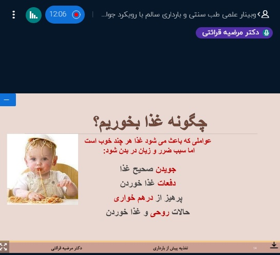 در این وبینار، مطالب جامعی در خصوص: مقدمه ای بر طب سنتی ابن سینائی، آشنایی با تدابیر تغذیه ای قبل از بارداری، ارائه درمان های مکمل در طب رایج و طب ایرانی پیش از بارداری، ملاحظات داروئی داروهای طب سنتی ارائه شد.