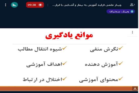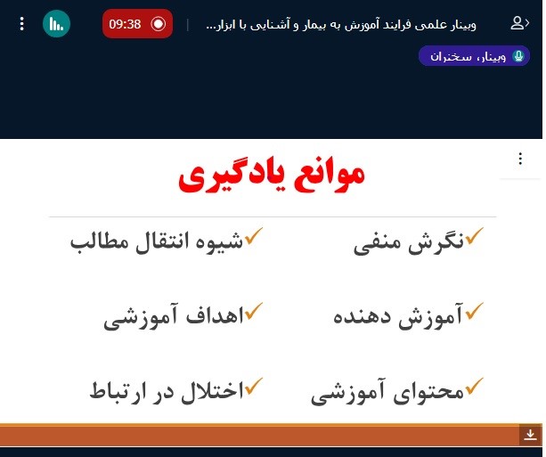در این وبینار، مطالب جامعی در خصوص: مفاهیم آموزش و یادگیری و اهمیت آموزش به مددجو، نقش پرستار در آموزش سلامت، استانداردهای آموزش به مددجو، تعیین نیازهای آموزشی مددجو، تعیین اهداف آموزشی، طبقه بندی اهداف (حیطه های شناختی-عاطفی-روانی-حرکتی)، روشهای آموزش به بیمار، وسایل کمک آموزشی، محتوای آموزش به بیمار، اهمیت ارزشیابی، انواع ارزشیابی،آشنایی با ابزار pemat ارائه شد.