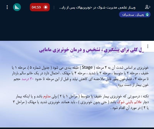 در این وبینار، مطالب جامعی در خصوص: علل و عوامل خطر خونریزیهای پس از زایمان، مدیریت خونریزی پس از زایمان و آشنایی با پروتکل مدیریت خونریزی، مراقبتهای پرستاری و خودمراقبتی در شوک هموراژیک ارائه شد.