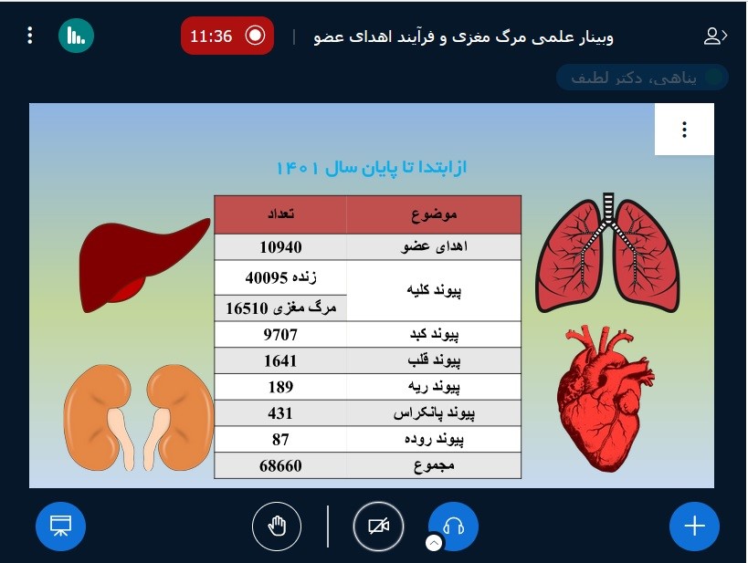 در این وبینار، مطالب جامعی در خصوص: تشخیص بالینی وپاراکلینیک مرگ مغزی، مراقبت از ارگانها درشرایط مرگ مغزی، وضعیت کنونی اهدای عضو در ایران و استان در زمان اپیدمی -19COVID، ضرورت ارتقای آن در جامعه و چالش های موجود، چالشهای مربوط به تشخیص وتائید مرگ مغزی درکودکان و تکنیک های رویارویی با خانواده های افراد مرگ مغزی ارائه شد.