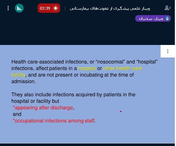 در این وبینار، مطالب جامعی در خصوص: تعریف عفونت های بیمارستانی( اپیدمیولوژی- انواع عفونت های بیمارستانی)، عفونت و ایزولاسیون، پیشگیری از عفونت های بیمارستانی در بخش های ویژه (پیوند– اتاق عمل، ICU)، نقش بهداشت محیط در کاهش عفونتهای بیمارستانی ارائه شد.