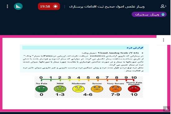 در این وبینار، مطالب جامعی در خصوص: اهمیت گزارش نویسی در پرستاری تعریف گزارش نویسی و انواع گزارش- روشهای ثبت گزارش، طریقه ثبت گزارش پرستاری در شیت بخش های ویژه، ارزیابی اولیه و ثبت صحیح در کاردکس ارائه شد.