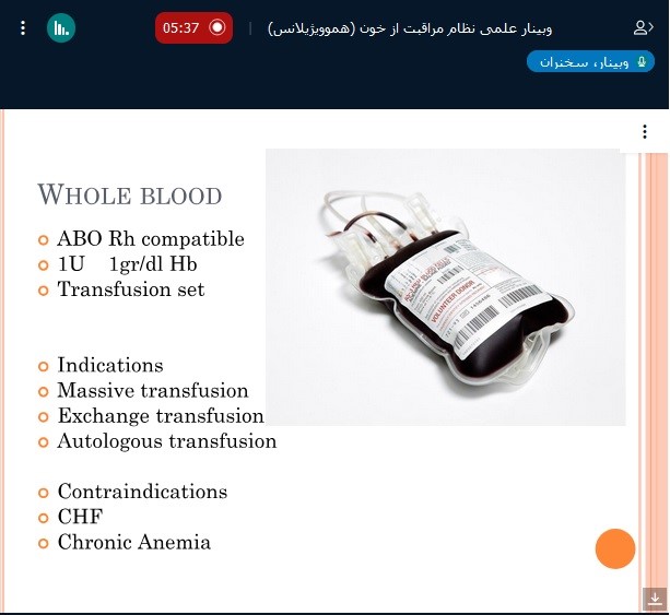 در این وبینار، مطالب جامعی در خصوص: آشنایی با فراورده های خونی و عوارض حاد و مزمن و تاخیری مرتبط با تزریق خون، آشنایی با نحوه تزریق خون و فراورده های خونی، مراقبت های پرستاری قبل و حین و بعد از تزریق خون ارائه شد.