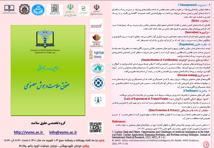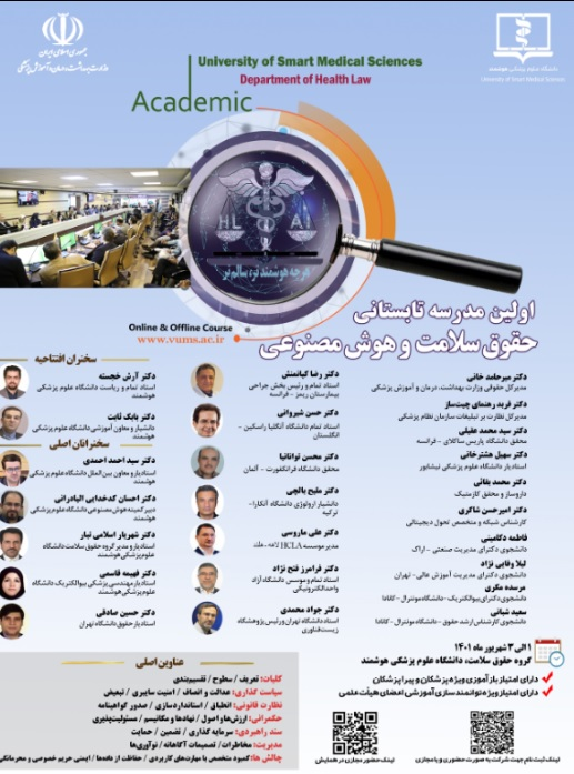 دانشگاه علوم پزشکی هوشمند ﻧﺨﺴﺘﯿﻦ ﻣﺪﺭﺳﻪ ﺗﺎﺑﺴﺘﺎنیLaw  « The First Health summer school» ﺳﻪ ﺭﻭﺯﻩ ﺗﺨﺼﺼﯽ ﺑﻪﺻﻮﺭﺕ ﺩﻭ ﺯﺑﺎﻧﻪ ﺗﺤﺖ ﻋﻨﻮﺍﻥ"ﺣﻘﻮﻕ ﺳﻼﻣﺖ  ﻫﻮﺵ ﻣﺼﻨﻮﻋﯽ" را با تدریس اساتید برجسته داخلی و برگزیده گانی از میان اساتید دانشگاه های کانادا، آلمان، فرانسه، ترکیه ، انگلستان و هلند از تاریخ اول لغایت سوم شهریور ماه سال 1401 به صورت مجازی و حضوری (ترکیبی)  برگزار می کند